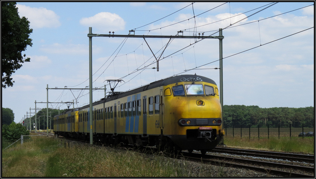 Ein Plan V Triebwagen der NS ( Mat´64 ) aus Roermond kommend,erreicht hier gerade den Bahnübergang bei Echt /NL am 10.Juni 2015.
