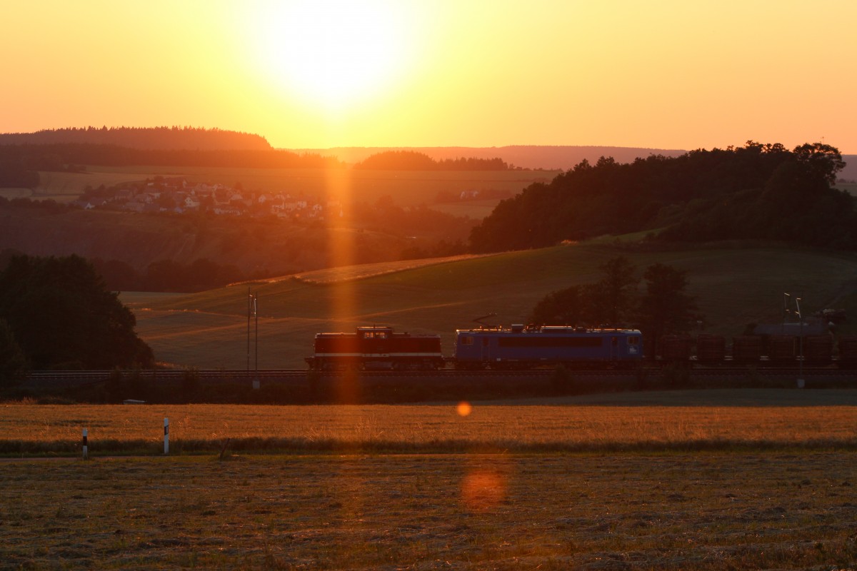 Holzvollzug mit ziehender 112 565 und 155 045 der Press bei Sonnenuntergang schlängeln sich durch das Vogtland nach Plauen. Gesehen am 30.6.2015
