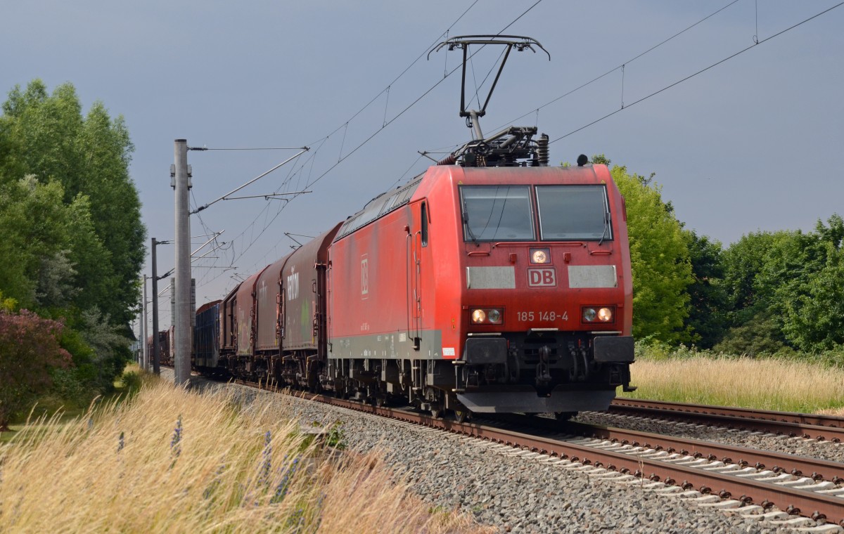 Mit einem gemischten Güterzug rollt 185 148 am 21.06.15 durch Greppin Richtung Bitterfeld.