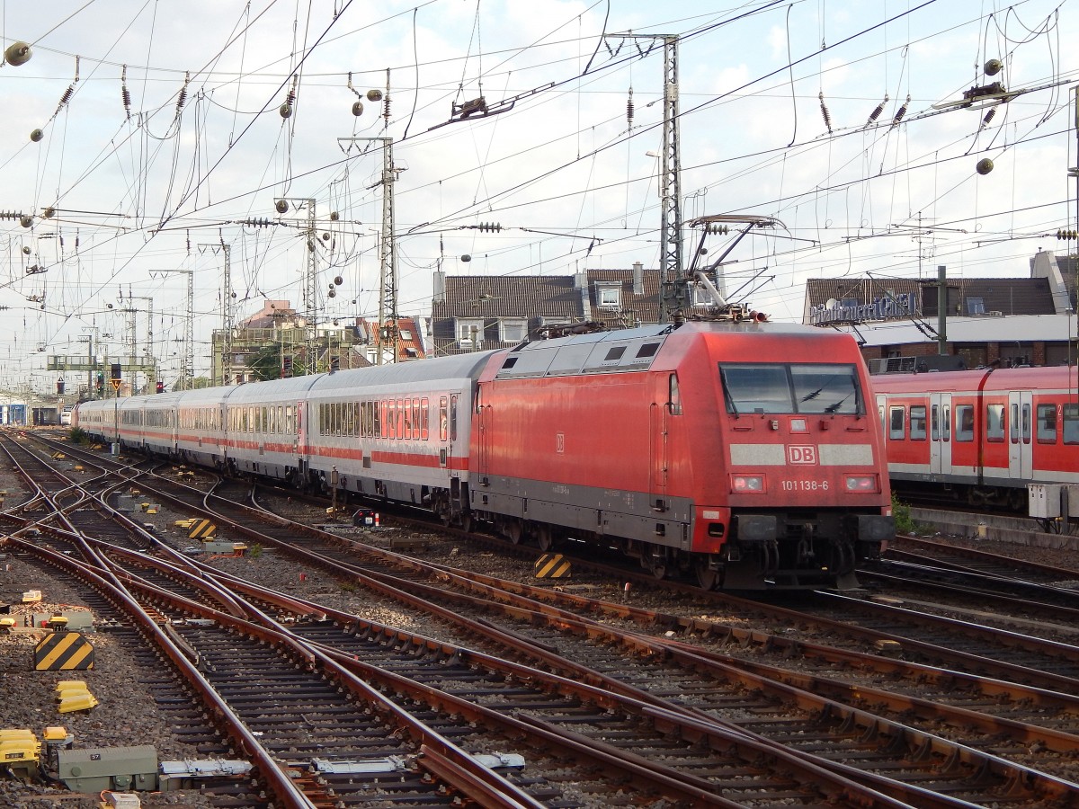 Nachschuss auf einem Zug auf ein IC Sandwich in Gleisfeld des Kölner Hbf. Vorne zieht 120 137-5 und hinten schiebt 101 138-6.