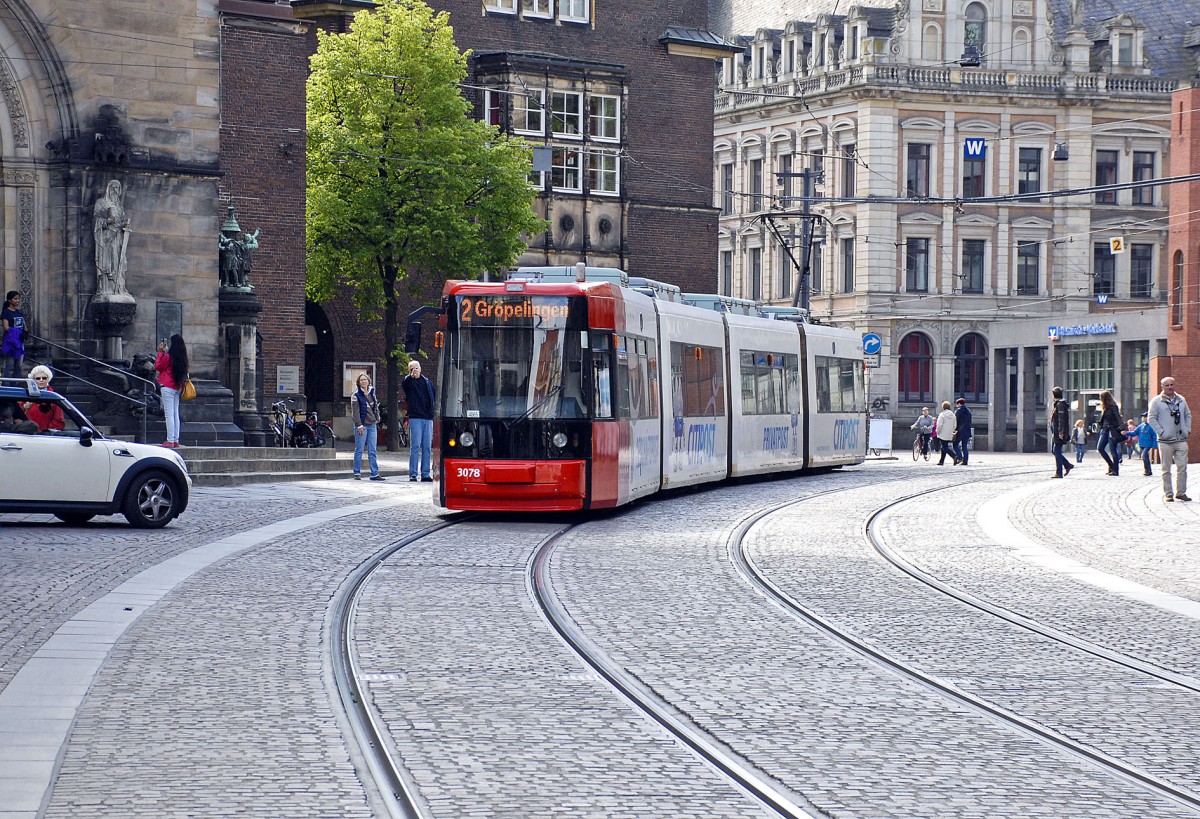 BSAG 3078 am Schüsselkorb in Bremen. GT8N ADtranz (Jahrgang 1996). Aufnahmedatum: 3.5. 2014