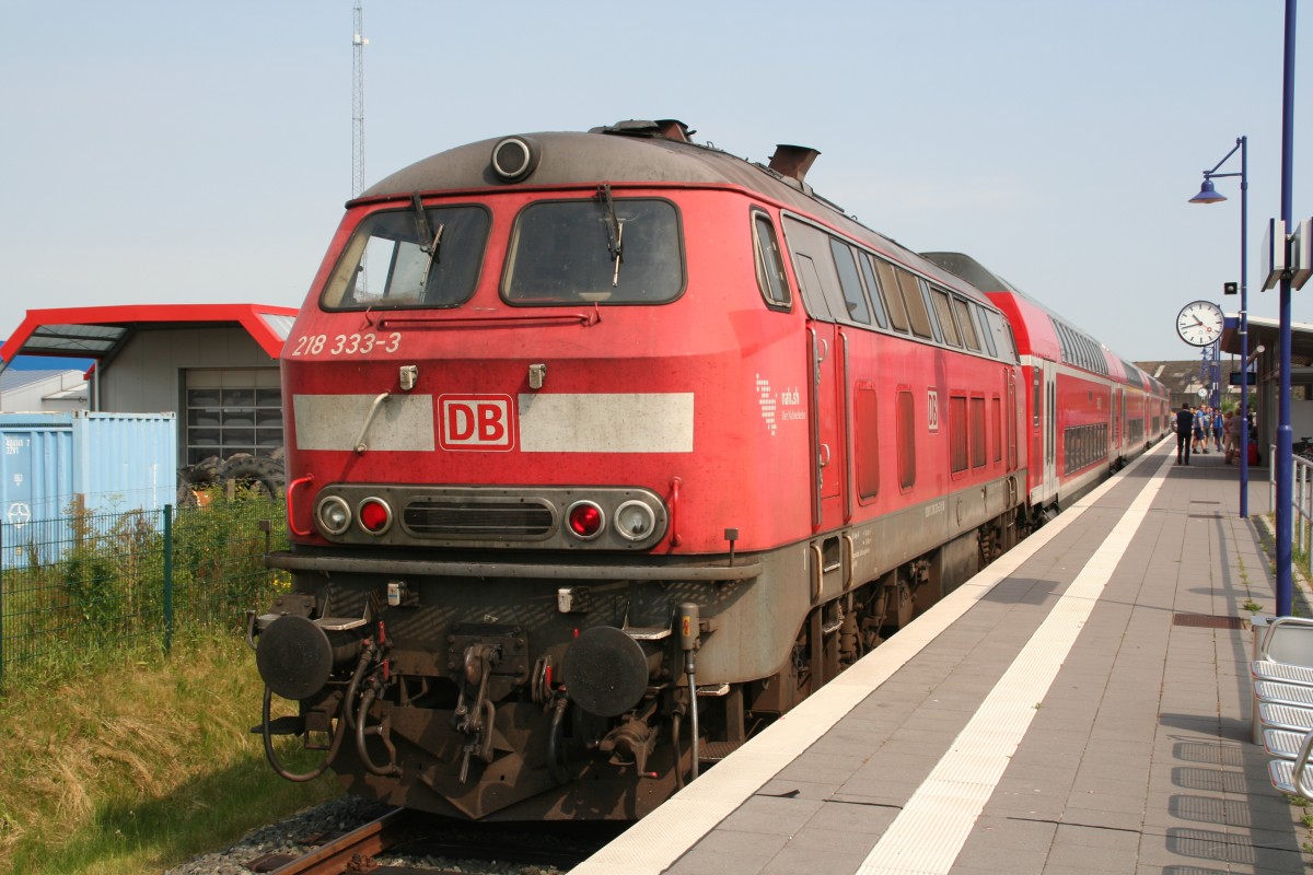 Burg auf Fehmarn am 04. Juli 2015: 218 333-3 ist gerade mit RE 21448 "Strandexpress" angekommen und fährt nach kurzem Aufenthalt weiter nach Puttgarden.