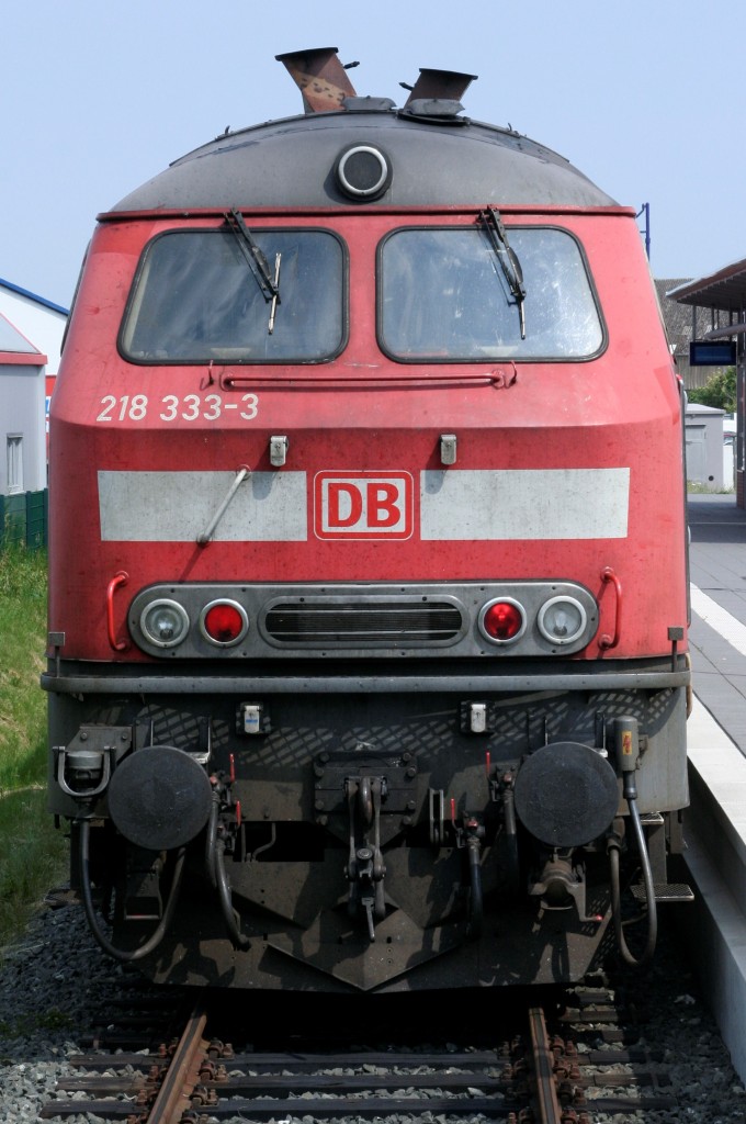 Das Gesicht einer Jubilarin: die 218 333-3 wurde am 04. Juli 2015 40 Jahre alt. Hier zu sehen im Bahnhof Burg auf Fehmarn.