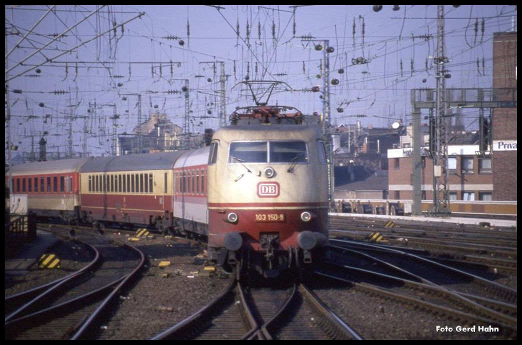 103150 lfährt am 27.2.1991 um 14.02 Uhr mit dem IC 524 "Münchner Kindl" in Köln HBF ein.