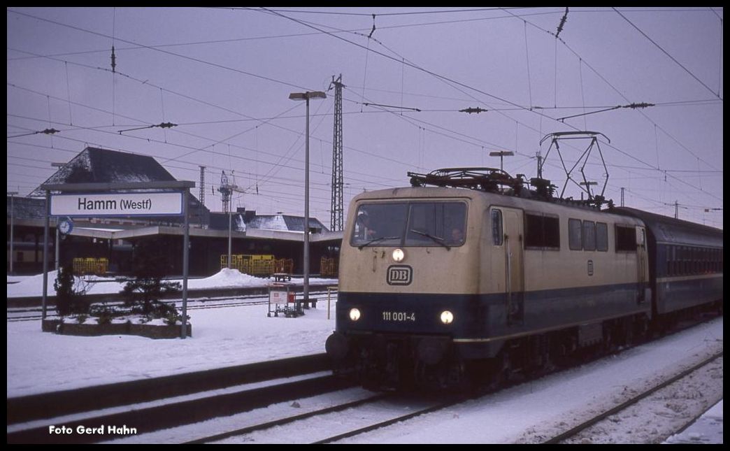 111001 ist am 14.2.1991 um 9.06 Uhr Zuglok vor dem FD 1902 "Bodensee" nach Konstanz.