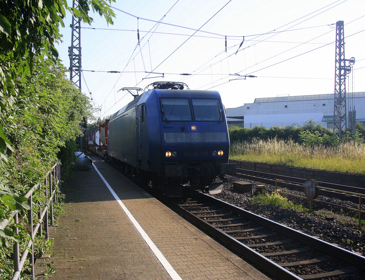 145 CL-202 von Crossrail kommt als Umleiter mit einem langen Contanierzug aus Novara(I) nach Zeebrugge-Ramskapelle(B) und fährt durch Kohlscheid aus Richtung Herzogenrath und fährt die Kohlscheider-Rampe hoch nach Aachen-West.