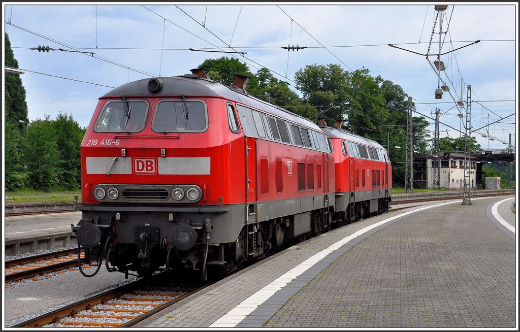 Während am 2.7.2014 der IC 119 zwischen Stuttgart und Ulm abweichend mit einer 101 bespannt wurde, war der IC 118 planmäßig mit 218 456 und einer weiteren 218 unterwegs und kam pünktlich durch Ebersbach