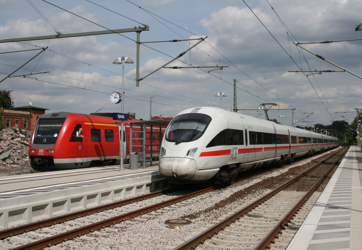 612 028 als RE 16290 (Apolda–Erfurt Hbf) und ÖBB 4011 091 als ICE 1746 (Dresden Hbf–Eisenach) am 15.08.2013 in Apolda