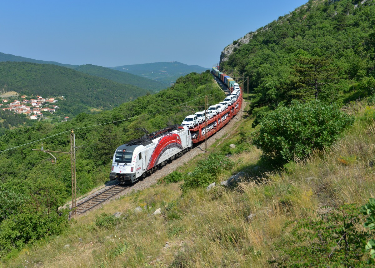 Das 4000. Bild auf Bahnbilder.de zeigt neben 541 104 "Chiquita" den neuesten Werbetaurus 541 016 der Slowenischen Staatsbahn (Slovenske železnice), der für den vor 60 Jahren verstorbenen Albert Einstein wirbt. Als ich einige Male an der Koperrampe war, konnte ich den noch sauberen weißen Stier oft ablichten. Eines der besten Bilder des Ochsen entstand jedoch am Donnerstag, den 11.06.2015. Dort eröffnete er gleich mit dem ersten Güterzug des Tages den Fototag. Bei Hrastovlje hat er einen langen Güterzug bestehend aus Autowagen und Containerwagen am Haken und wird bald die Hafenstadt Koper erreichen.