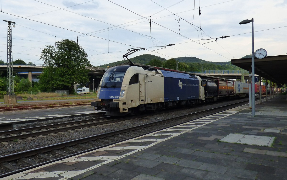 Die 1216 952 der WIENER LOKALBAHN mit einem Güterzug in Richtung Norden durch Königswinter , Den 05.07.2015
