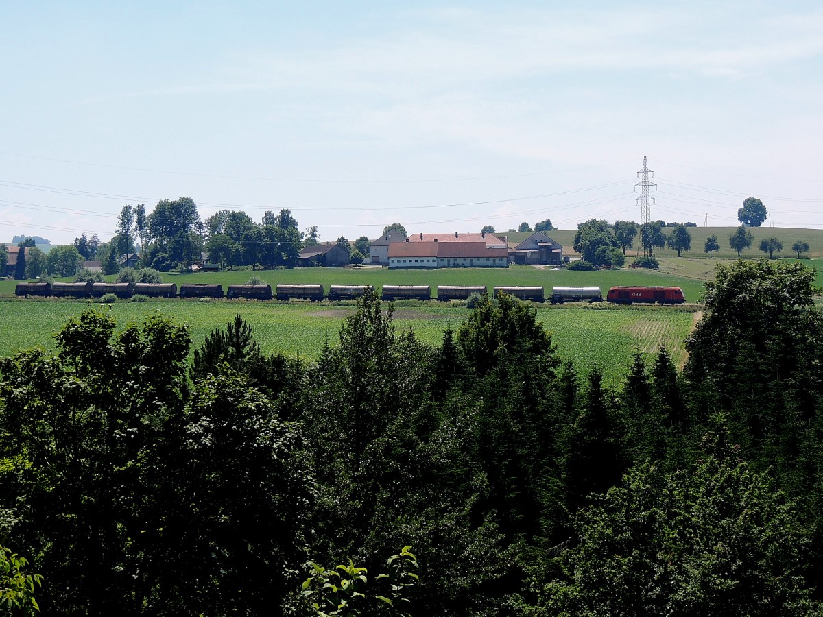 Diesellok der BR 2016 zieht den werktäglichen Kesselwagenleerzug G47850 auf der Hausruckbahn in Richtung Ried; 150703