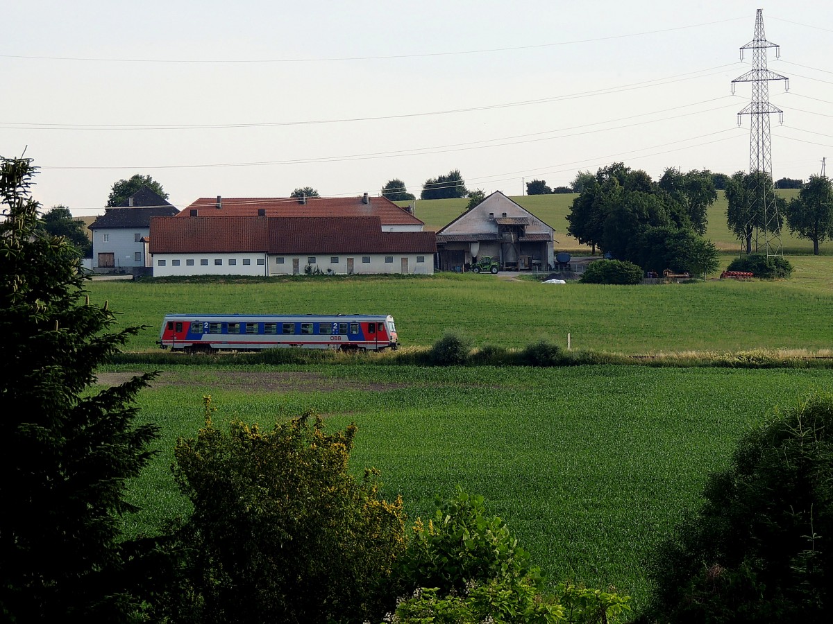 Hinter den Bäumen, und zwischen den Feldern; tuckert ein Triebwagen der BR5047 als R3492 auf der Hausruckbahn in Richtung Attnang; 150703