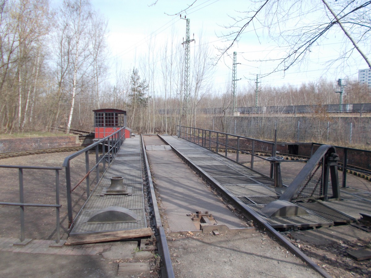 Im Naturpark Schöneberger Südgelände hat man die,nicht mehr genutzte,Drehscheibe vom ehemaligen Bw Berlin Tempelhof,zum Besichtigen,liegen gelassen.Aufnahme vom 11.April 2015.