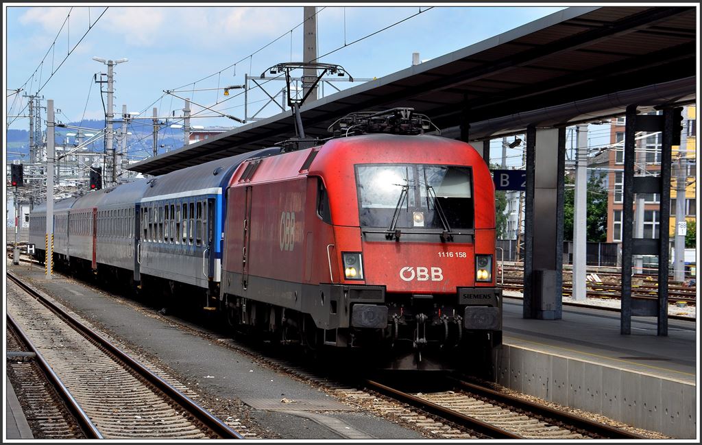 R1543 aus Prag mit der 1116 158 trifft in Linz Hbf ein. (29.06.2015)
