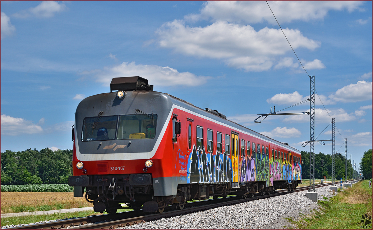 SŽ 813-107 fährt durch Cirkovce-Polje Richtung Maribor. /22.6.2015