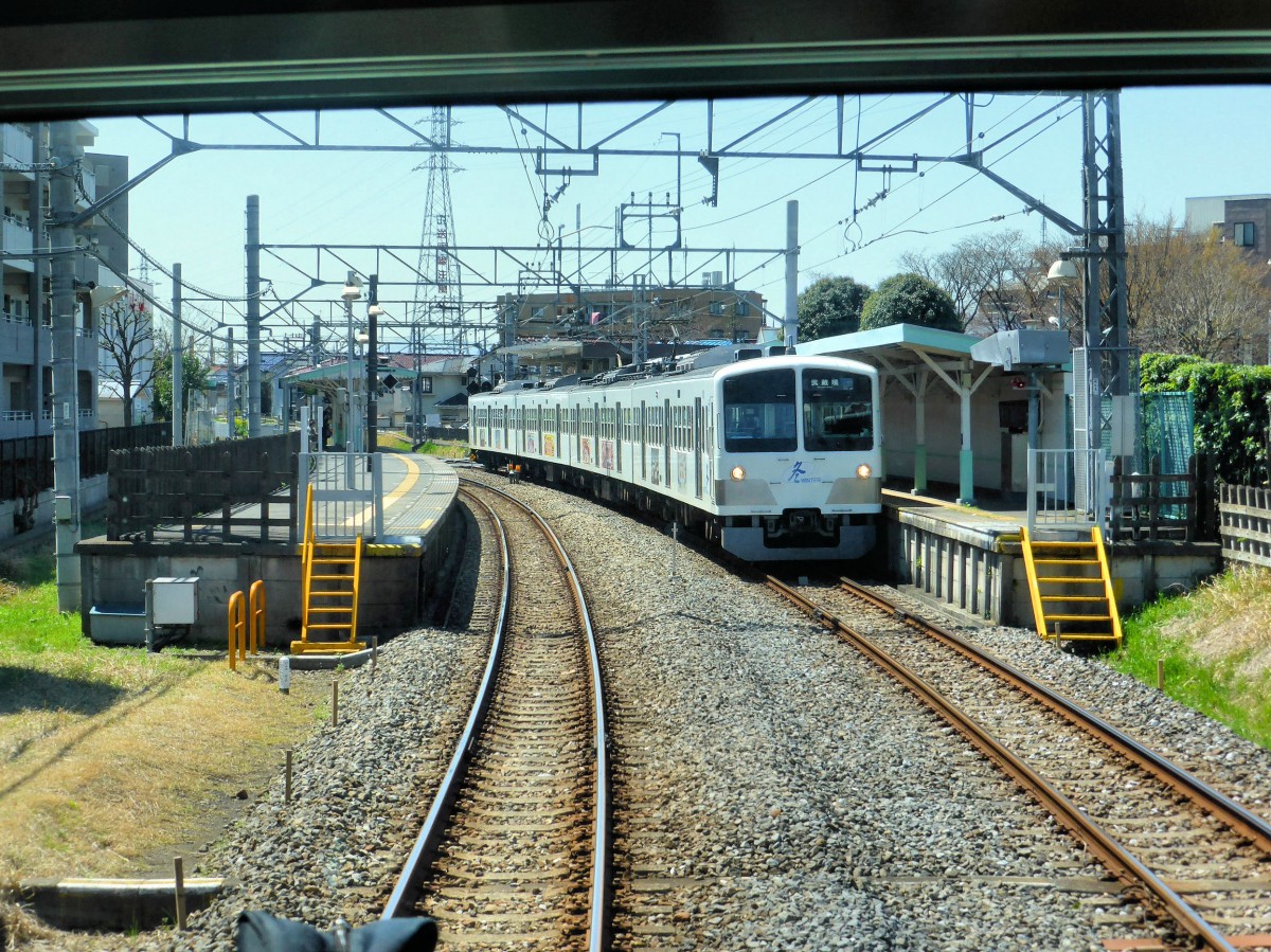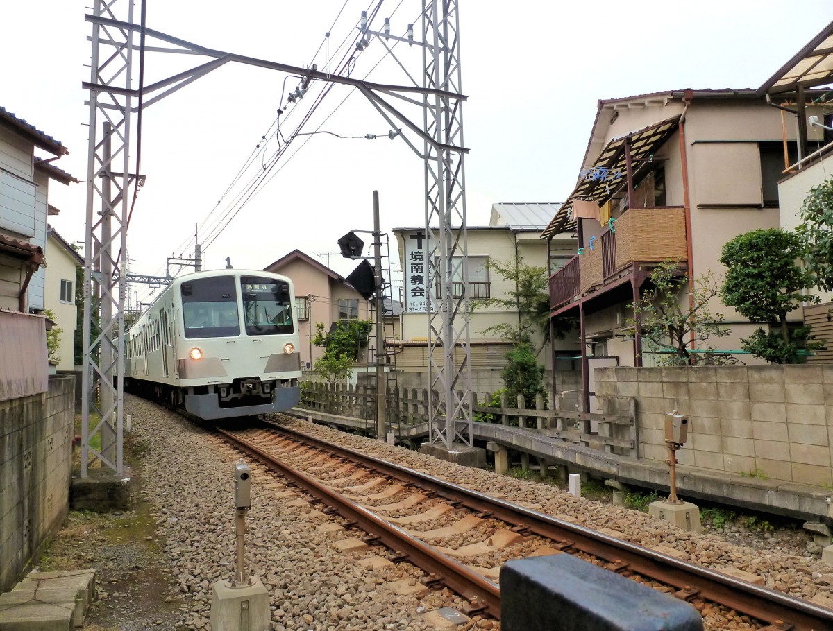 Seibu-Konzern, Tamagawa-Linie: Wie bei den meisten Linien dieses Konzerns fährt man eng zwischen den Häusern der Siedlungsgebiete hindurch, nicht zuletzt auch deshalb, weil Seibu eigentlich ein Konzern zur Erschliessung des Landes westlich von Tokyo gewesen ist. Die Tamagawa-Linie ist eine kurze, vom übrigen Netz isolierte Linie von 8 km Länge. Im Bild Zug 251 (Serie 100) bei Tokyo-Musashi Sakai, 11.Oktober 2011.