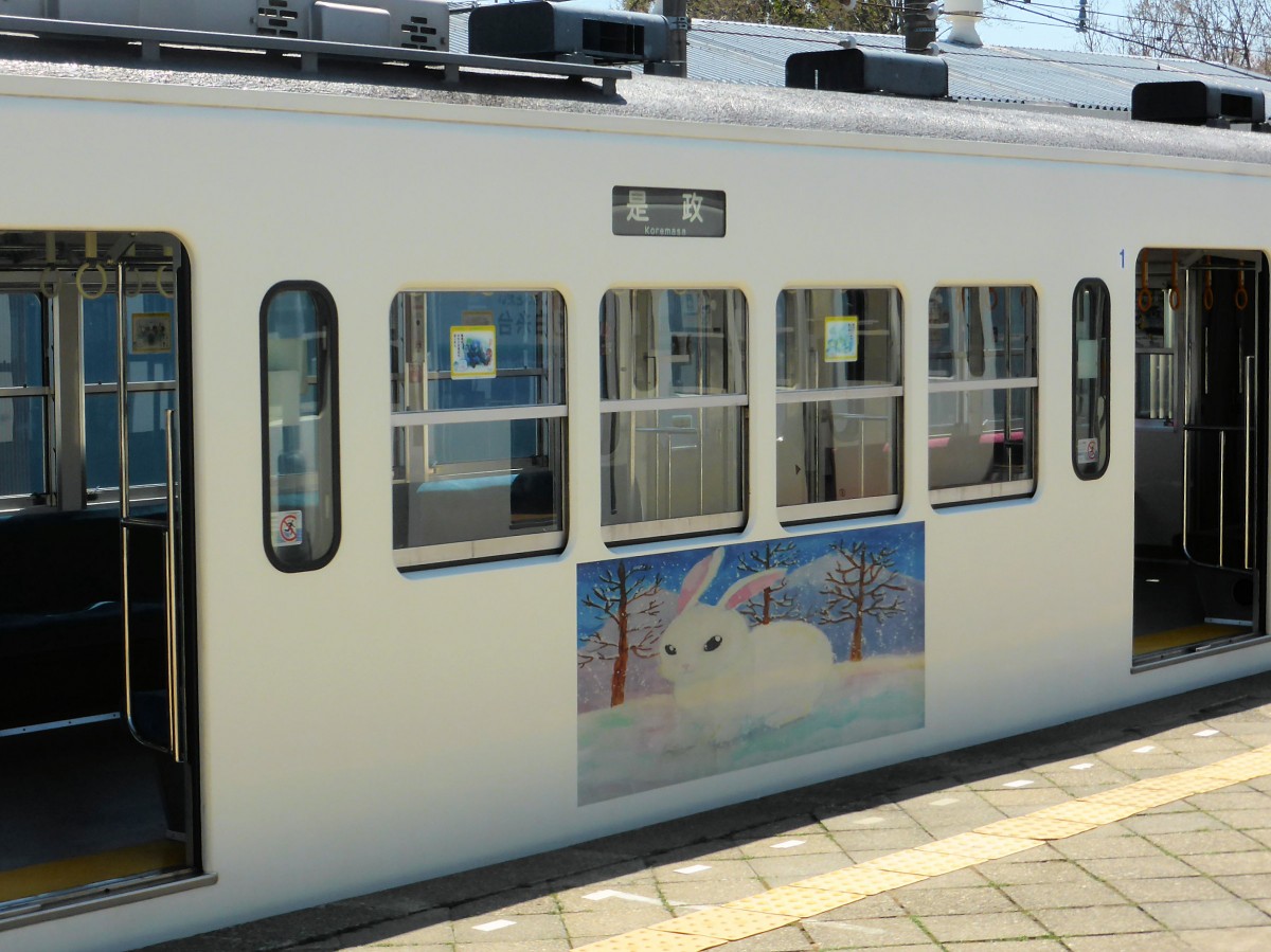 Seibu-Konzern, Tamagawa-Linie: Die Züge sind den 4 Jahreszeiten gewidmet; im Bild steht Zug 253 "Winter" (Serie 101) in Shin Koganei, 31.März 2014. Es handelt sich hier um die letzten 9 Züge der Serie 101 (gebaut 1969-1984).