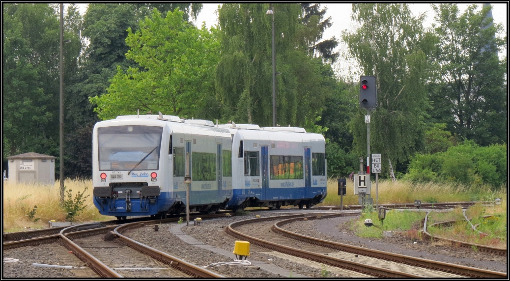 Sonntagsszenario aus Lendersdorf bei Düren. Ein Regio Shuttle der Rurtalbahn verlässt gerade den Bahnhof in Richtung Heimbach. Bildlich festgehalten am 05.Juli 2015.