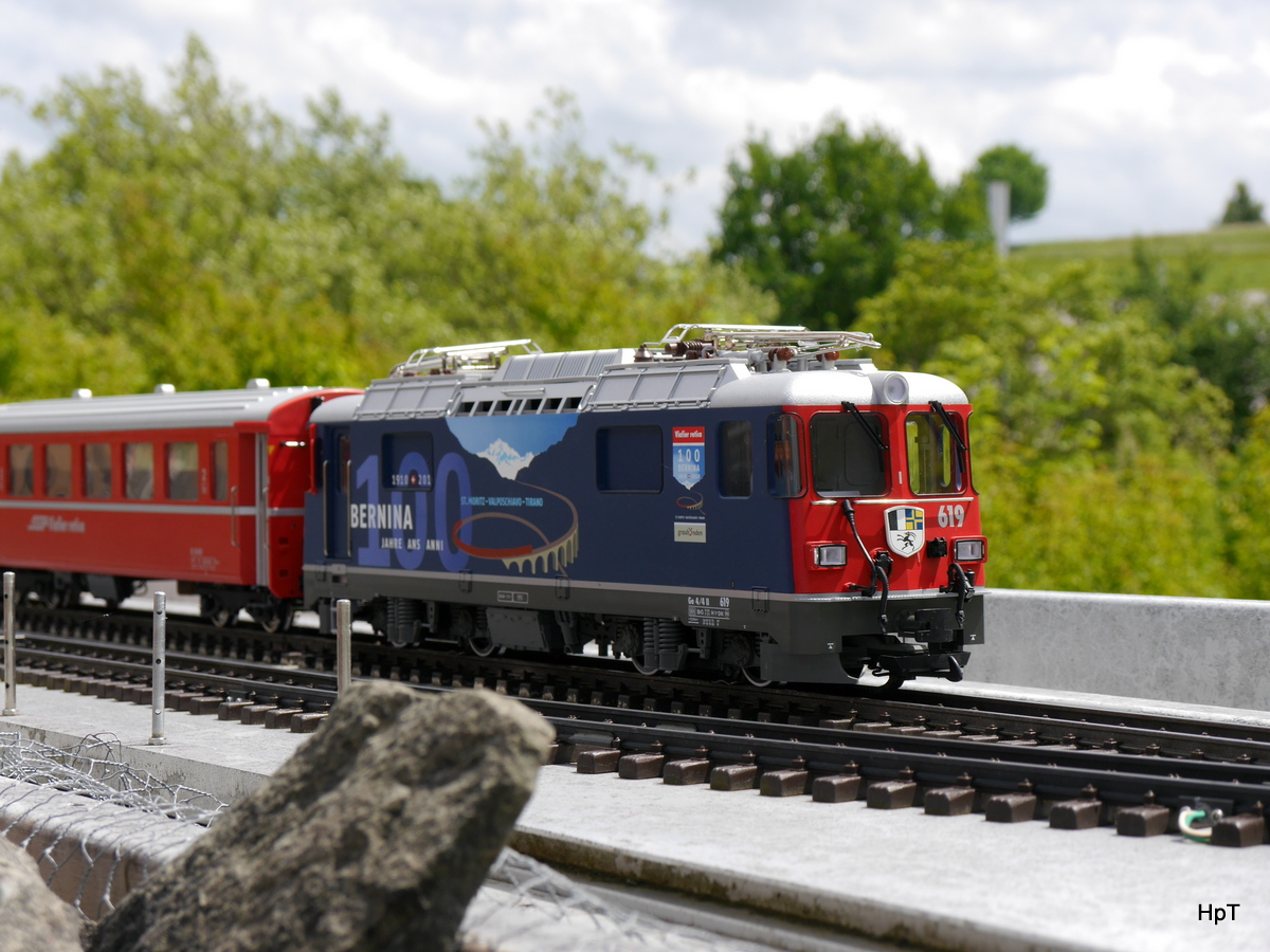 Stiftung Bernaville Schwarzenburg - LGB Ge 4/4 619 mit Personenzug unterwegs auf der Anlage am 30.05.2015