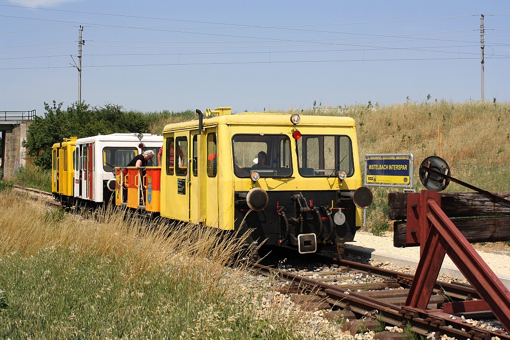 Zayataler Schienentaxi, bestehend aus VSS X626.192, X501.6113, X501.0002 und X626.172 (v.L.n.R.), am 05.Juli 2015 in der neuen Endstelle Mistelbach Interspar.
