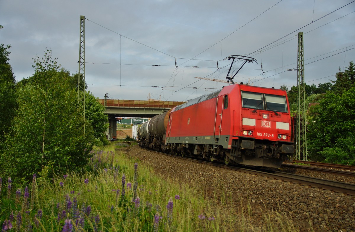 185 373-0 ist mit einen Kesselzug bei Götzenhof/Fulda am 10.06.15 unterwegs.