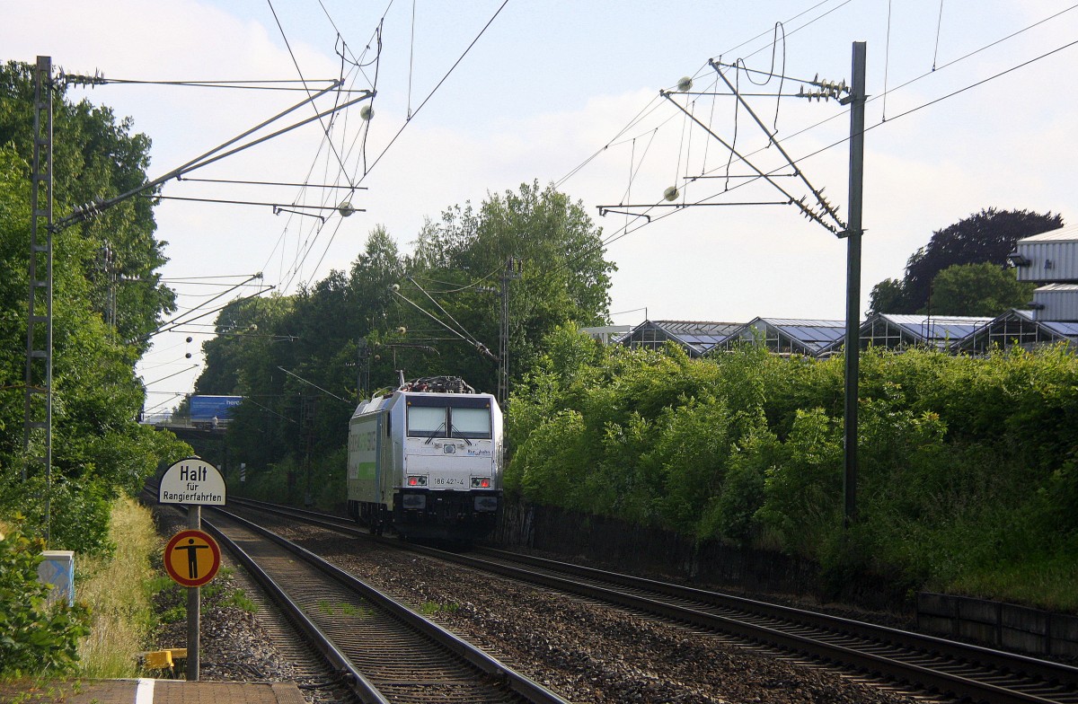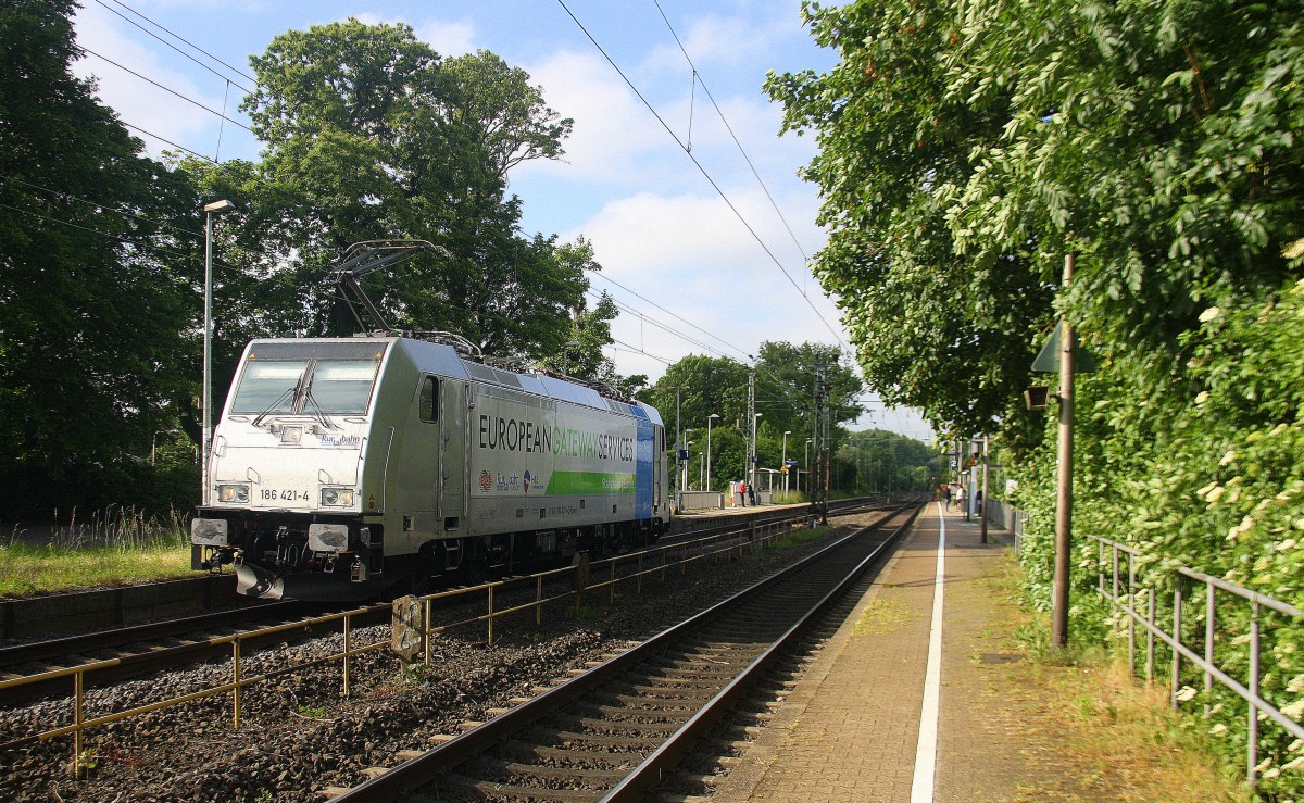 186 421-4 von der Rurtalbahn kommt aus Richtung Aachen-West,Laurensberg,Richterich und fährt durch Kohlscheid und fährt als Lokzug aus Aachen-West nach Neuss und fährt durch Kohlscheid und fährt in Richtung Herzogenrath,Neuss. Bei Sonne und Wolken am Morgen vom 8.6.2015.