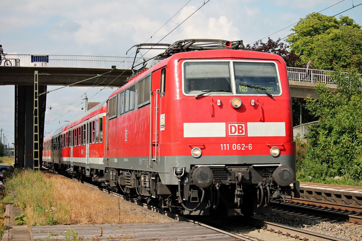 Ausfahrt von der Freiburger 111 062-6 "Neuenburg (Baden)" am 11.07.2014 mit einer RegionalBahn (Offenburg - Schliengen) aus Orschweier gen Ringsheim.