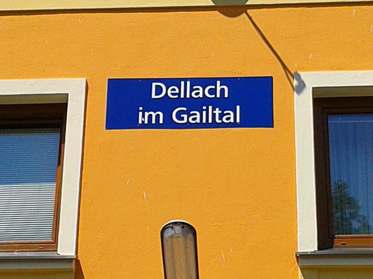 Bahnhofsschild von Dellach im Gailtal am 7.6.2015