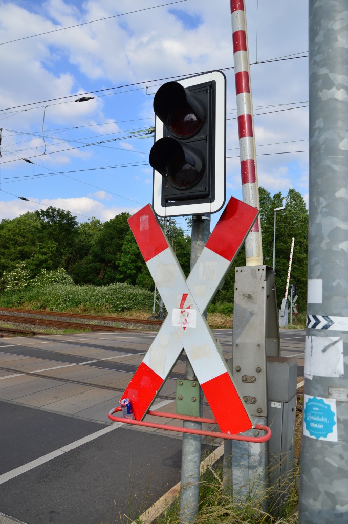 Damit es dem Andreaskreuz nicht so geht wie mir und das Kreuz aushängt, hat es sich einen Energiedrink eines namhaften österreichischen Herstellers wohl zu Gemüte geführt und hält diese noch unten rechts im Bild zusehen fest.....;D....Grevenbroich Bü Blumenstraße am Dienstag den 9.6.2015