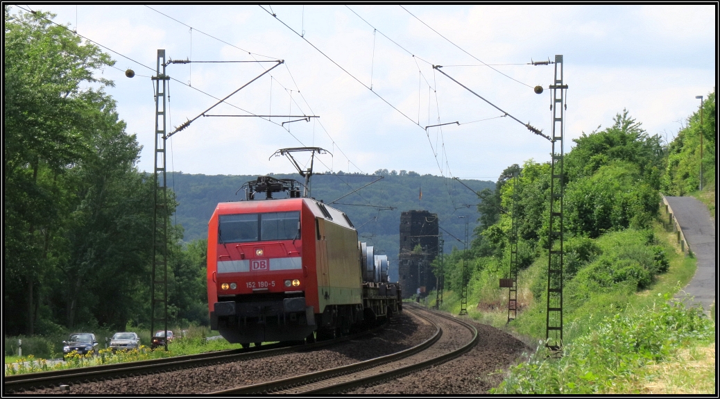 Die 152 290-5 ist mit einem Coilzug am Haken unterwegs auf der rechten Rheinstrecke in Richtung Neuwied. Szenario bei Erpel,unweit von Linz am Rhein am 09.Juni 2015.