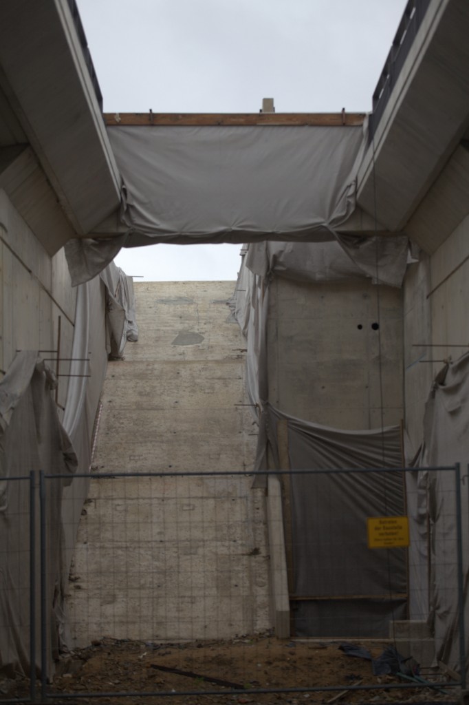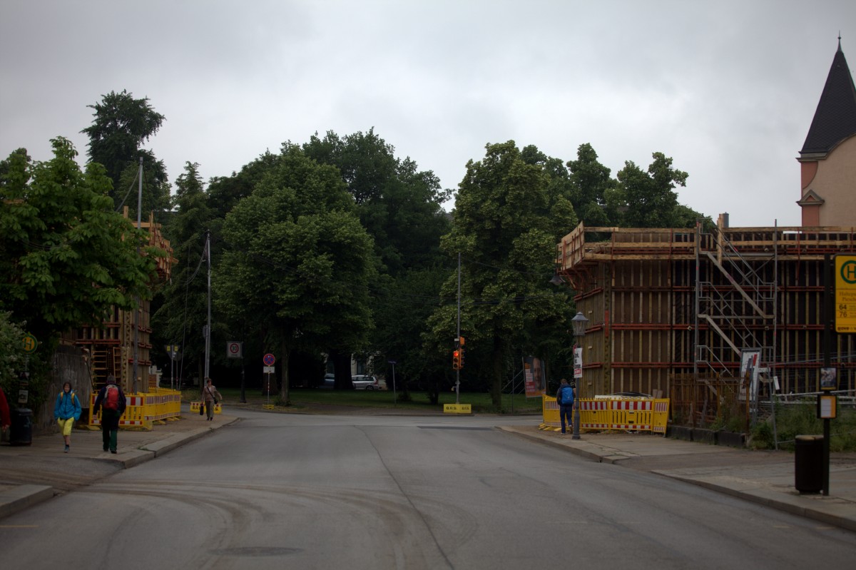 Die Schalung für die neuen Brückenwiederlager am Leisniger Platz in Dresden Pieschen ist fertig, noch ist der Durchblick zum Leisniger Platz frei. 09.06.2015 13:43 Uhr.