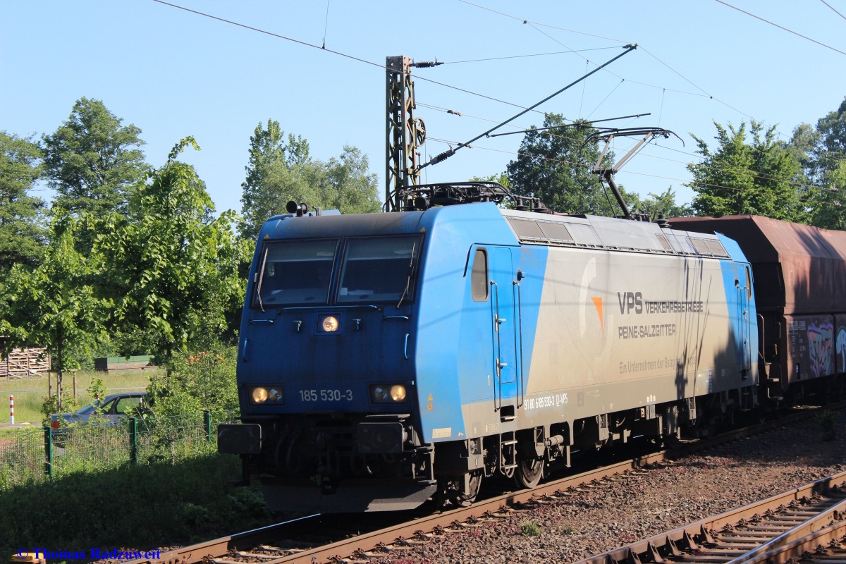 Private e185 530-3 der Verkehrsbetriebe Peine-Salzgitter am 6.Juni 2015 in Ehlershausen zwischen Lehrte und Richtung Celle.