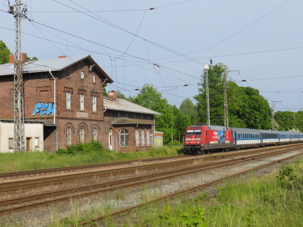 101 100 mit dem EC 378 von Bratislava am 29.05.2015 in Miltzow. Aufgenommen von der ehemaligen Ladestraße in Miltzow.