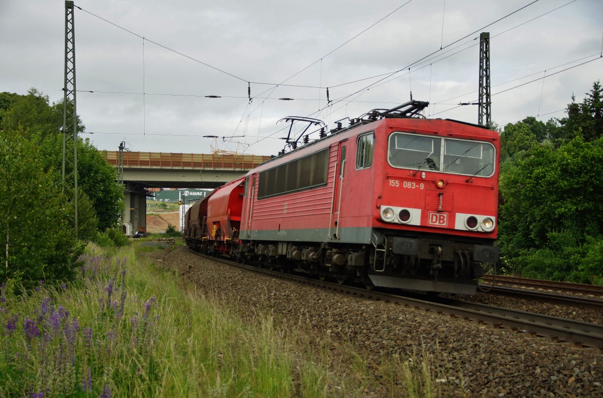 155 083-9 ist am 10.06.15 mit einen Schüttgutzug bei Fulda/Götzenhof unterwegs.