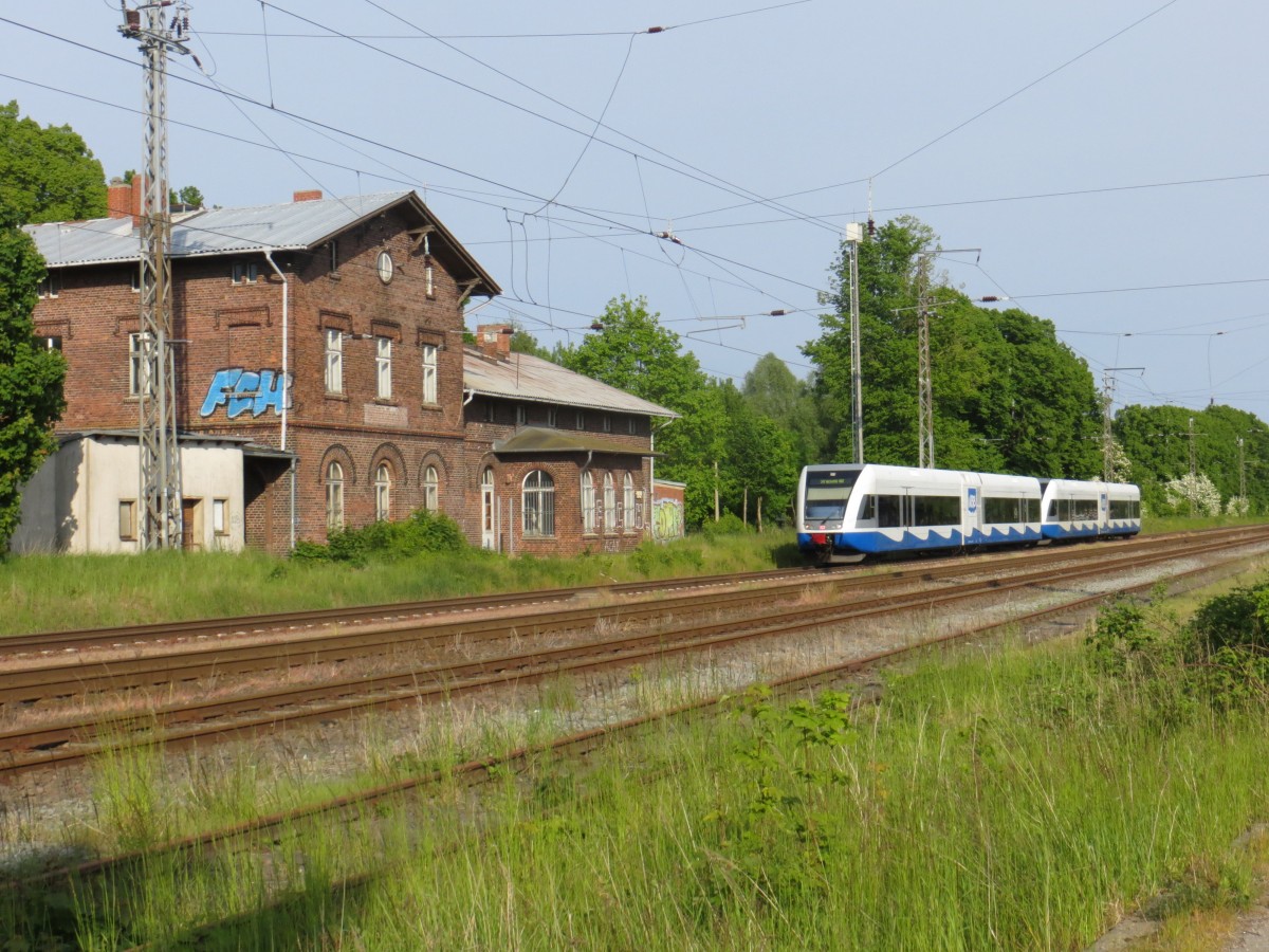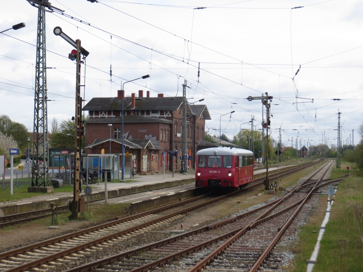 172 001 der Hafenbahn Neustrelitz e.V. am 27.04.2015 bei der Durchfahrt im Bf Grimmen. Der VT war auf dem Weg nach Bergen (Rügen).