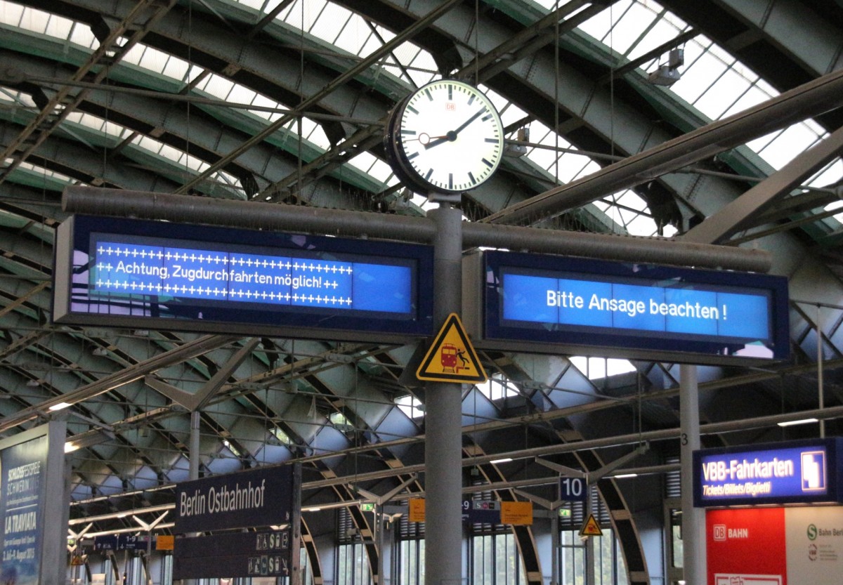9.6.2015 Berlin Ostbahnhof. Um die Sicherheit der Fahrgäste zu erhöhen wird letzteren die Möglichkeit von Zugdurchfahrten im Gleis angekündigt. Ob bei Ein- und Rangierfahrten umgeschildert wird, ist nicht bekannt.