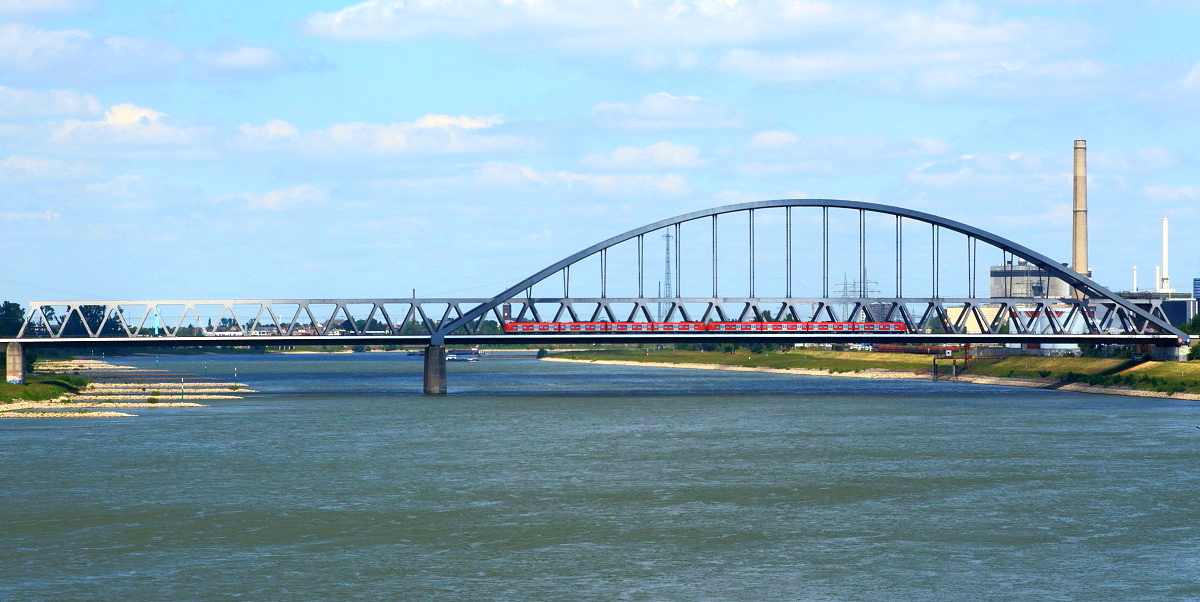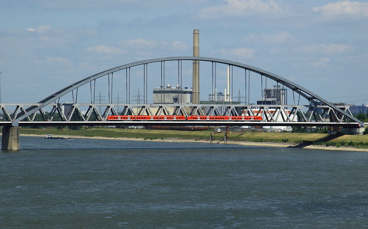 Zwei unbekannte 1 440 sind am 08.06.2015 auf der Rheinbrücke zwischen Neuss und Düsseldorf als S 8 unterwegs. Mit 250 m hat sie die zweitlängste Spannweite aller deutschen Eisenbahnbrücken. Im Hintergrund ist das Kraftwerk Lausward der Stadtwerke Düsseldorf zu sehen.