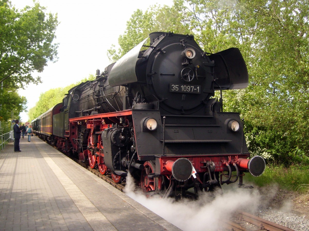 Dampflok 35 1097-1 ist am 30.05.2015 mit einem Sonderzug in Lauterbach-Mole auf der Insel Rügen eingefahren