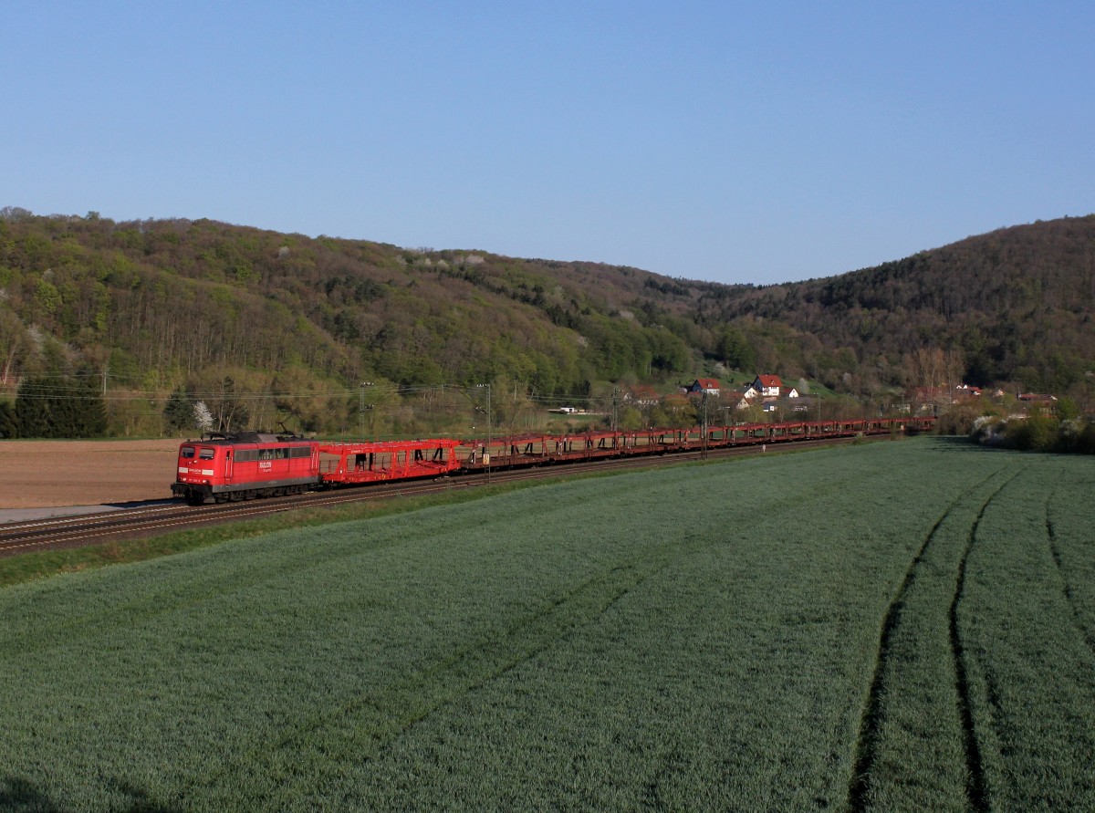Die 151 139 mit einem leeren Autozug am 18.04.2015 unterwegs bei Harrbach.