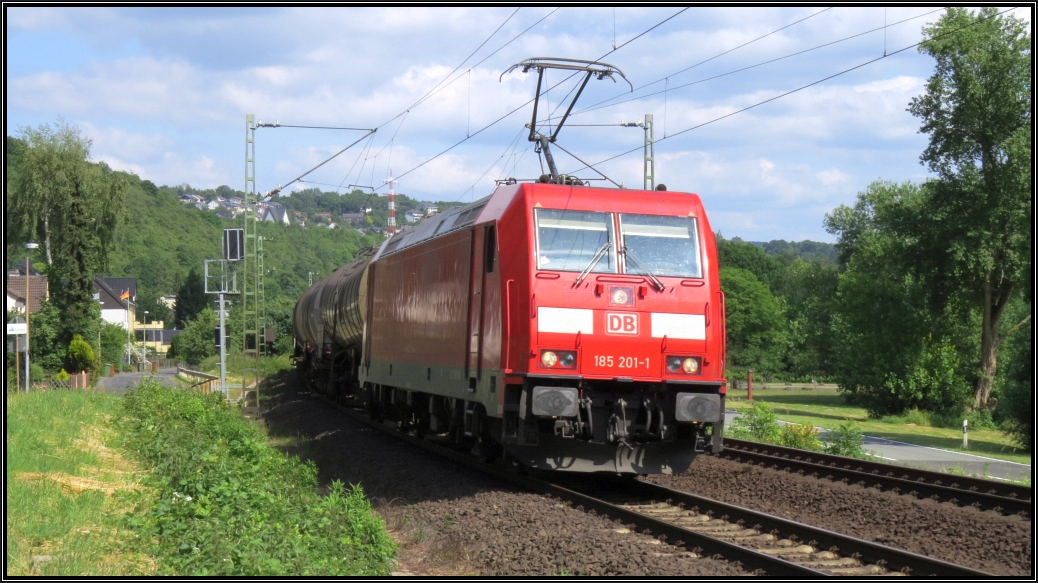 Die 185 201 ist mit einen Kesselwagenzug unterwegs auf der rechten Rheinstrecke bei Erpel.Szenario vom 09.Juni 2015 unweit von Linz am Rhein.