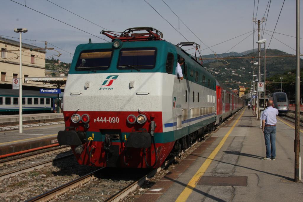 E 444-090 der FS hat am 10.06.2016 im italienischen Grenzbahnhof einen aus Frankreich gekommenen Schnellzug bespannt.