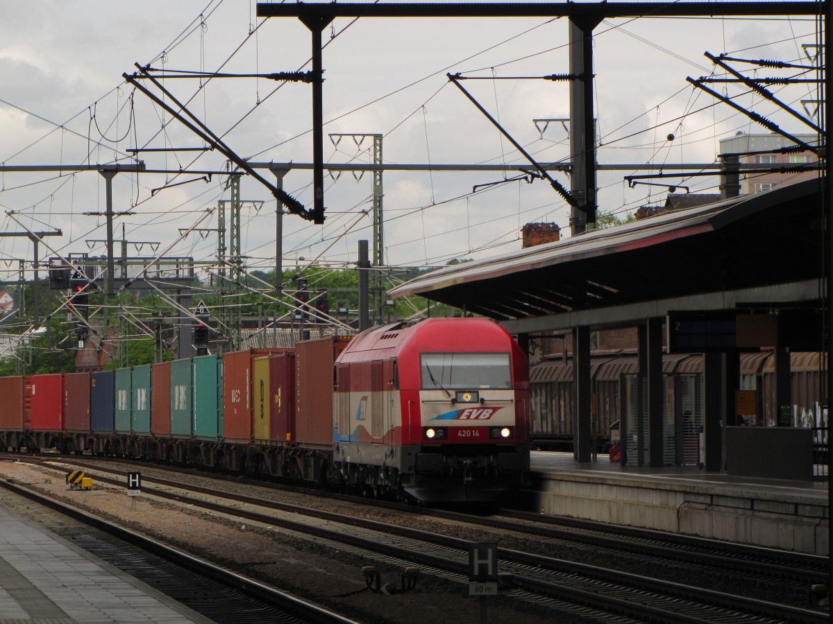 EVB 420 14 mit einem Containerzug Richtung Weimar, am 09.06.2015 in Erfurt Hbf.