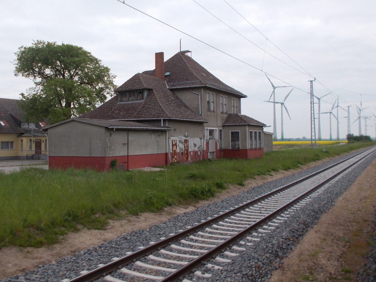Für ein Apel und ein Ei steht das ehemalige Bahnhofsgebäude von Klein Bünzow(Strecke Stralsund-Berlin),am 23.Mai 2015,zum Verkauf.
