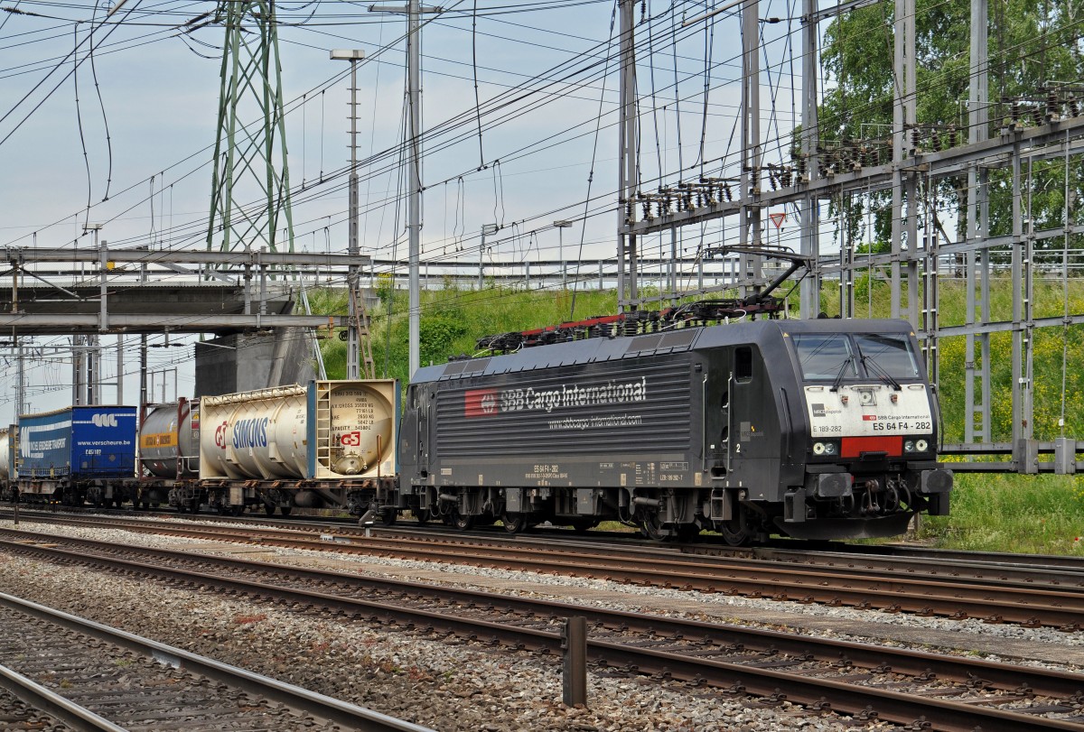 Lok 189 282-7 durchfährt den Bahnhof Muttenz. Die Aufnahme stammt vom 23.05.2015.