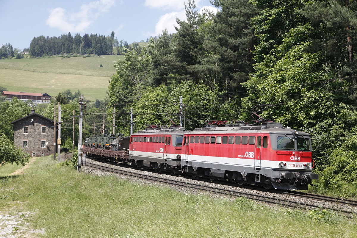 1142 554 + 1142 639 mit Militärgüterzug nahe Klamm-Schottwien am 12.06.2015.