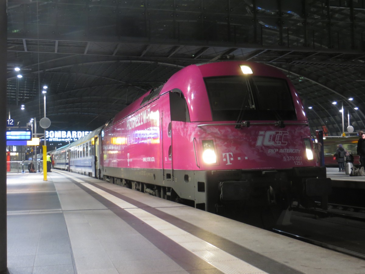 370 007 der PKP im sehr gewöhnungsbedürftigen Outfit am 23.01.2015 in Berlin Hbf.