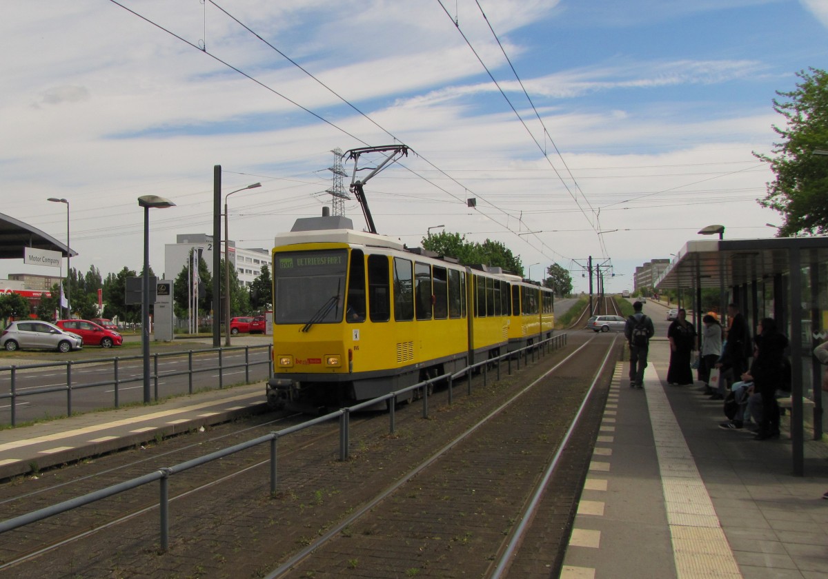 Ein Triebwagen der Linie M5 zum Bh Lichtenberg, am 02.06.2015 auf der Rhinstraße, Ecke Allee der Kosmonauten.