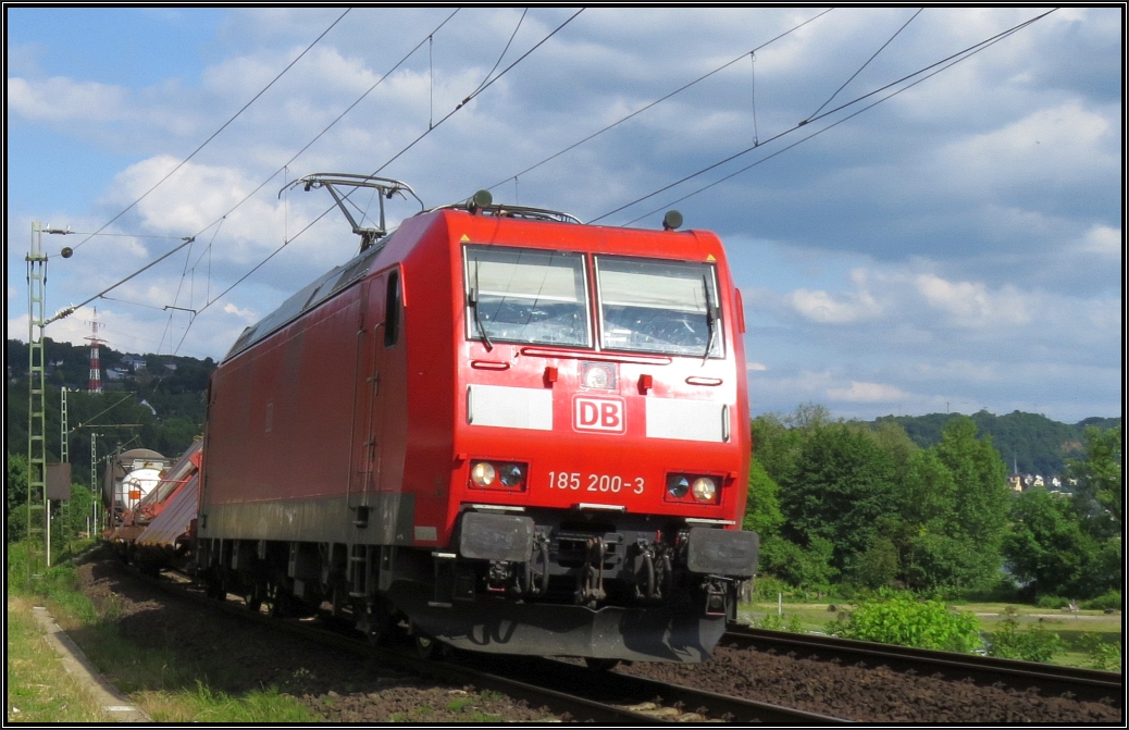 Die 185 200-3 ist mit einen Güterzug auf der rechten Rheinstrecke unterwegs,hier zu sehen unweit von Linz am Rhein am 09.Juni 2015.