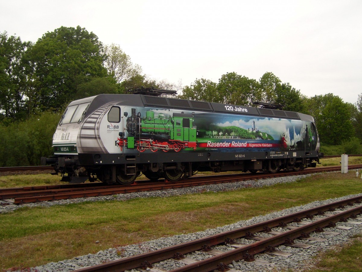 E-Lok 145 023-6 bekam anlässlich des Jubiläums der Rügenschen Bäderbahn diese schöne Lackierung und war am 30.&31.05.2015 auf dem Ausstellungsgelände im Bahnhofsbereich Putbus zu sehen.