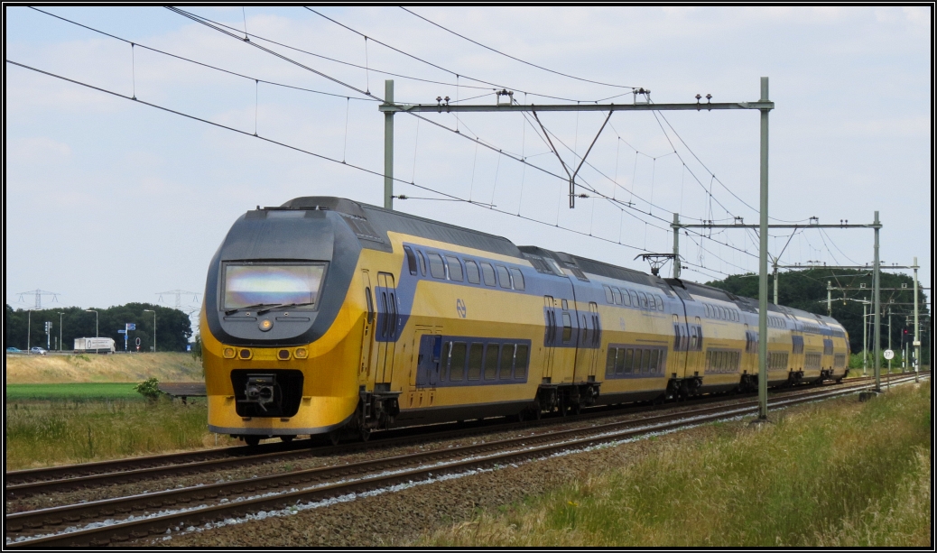 Ein Virm Doppelstock Triebwagen der NS ist unterwegs nach Sittard (NL),hier zu sehen unweit von Echt-Susteren in Limburg am 10.Juni 2015.